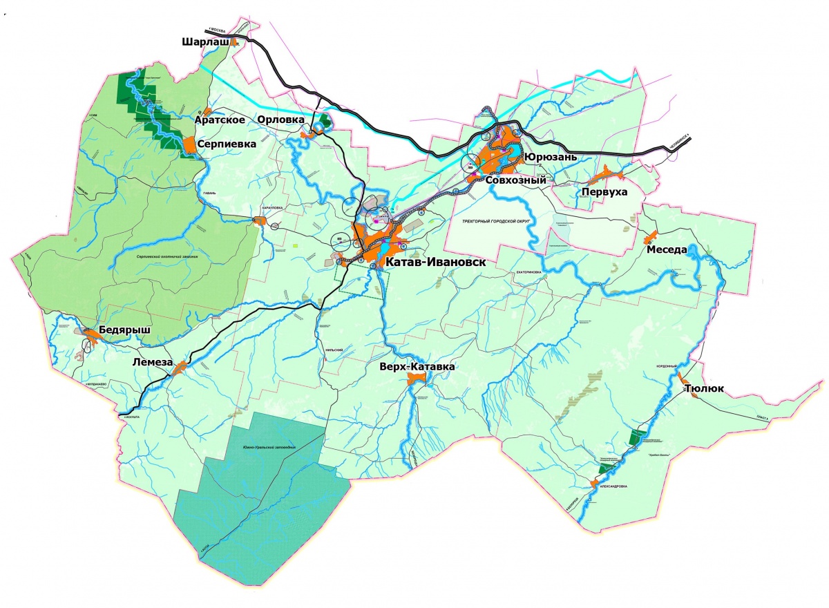 Катав-Ивановский муниципальный район расположен в 320 км (по автомобильной дороге) от областного центра - г. Челябинска. Площадь муниципального района – 3277,98 км 2 . Границами муниципального района являются: на севере – республика Башкортостан и Усть-Катавский городской округ, на северо-востоке – Трехгорный городской округ, на северо-востоке и востоке – Саткинский муниципальный район, на юге – республика Башкортостан, на западе – Ашинский муниципальный район. Протяженность планируемой территории в направлении с севера на юг составляет 65 км, с запада на восток – 85 км. По территории района проходят: ответвление от железнодорожной магистрали Москва-Челябинск: ст. Вязовая – Юрюзань – Катав-Ивановск; автодорога федерального значения Москва – Челябинск – Екатеринбург (М-5 «Урал»); - сеть территориальных автодорог, связывающая район с соседними муниципальными - образованиями и с республикой Башкортостан; магистральный газопровод «Бухара-Урал»; отводы от «Бухара-Урал» до ГРС Златоуст- 36, ГРС г. Катав-Ивановск, ГРС г. Юрюзань. В составе муниципального района 2 городских и 8 сельских поселений с 19 населенными пунктами, административный центр – г. Катав-Ивановск. Общая численность населения муниципального района – 35,7 тыс. чел., плотность населения – 11 чел./км2 . Схемой территориального планирования Челябинской области (Челябинскгражданпроект, 2008 г.) выделена горно-лесная зона (северо-западная часть области, в т. ч. Катав - Ивановский район), которая имеет свою специфику и направленность развития: предусмотрено формирование спортивных комплексов, центров индустрии отдыха и туризма на базе существующих и развиваемых особо охраняемых природных территорий (заповедников, заказников, геологических и гидрологических памятников природы и др.).