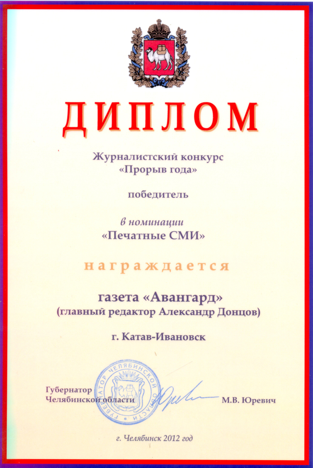 В минувшую пятницу газета Катав-Ивановского района стала победителем в престижном журналистском конкурсе «Прорыв года» в номинации «Печатные СМИ», который проводился под патронажем губернатора Челябинской области Михаила Юревича. Диплом главному редактору газеты «Авангард» вручил первый заместитель губернатора Челябинской области Олег Грачев.
