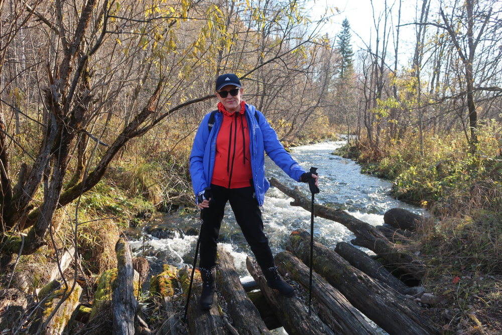 Тропа витиевата, а внимательный турист прочитает на ней много всего интересного. Вот Владимир Алексеевич Белобров показывает нам свежие следы медведя, рисунок чёткий, отпечаток от когтей – глубокий. Мы достали фотоаппараты и запечатлели картинку. И не думайте, что дальше мы увидели что-то страшное. У нашего опытного инструктора всегда наготове ружьишко.