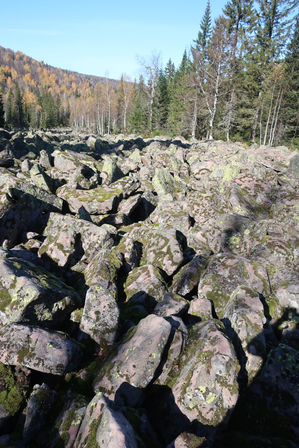 Курумник у подножия Бахмура покрыт цветным лишайником, розово-серого и зелёного цвета.