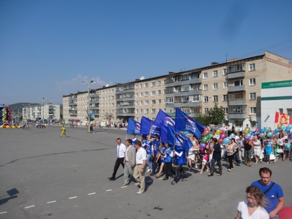 В 10.00 площадь заполнилась людьми. Все шли с шарами, нарядные, красивые. Торопились в колонны трудовых коллективов, общественных организаций, чтобы достойно пройтись по площади, ведь в этот день был объявлен и конкурс «На лучшее оформление колонны». В демонстрации приняли участие почти все ведущие коллективы Катав-Ивановска. Как здорово они смотрелись со стороны, буквально залитые золотыми лучами солнца! Первой открыла торжественное шествие колонна местного отделения партии «Единая Россия». Свою визитку мы представили так: