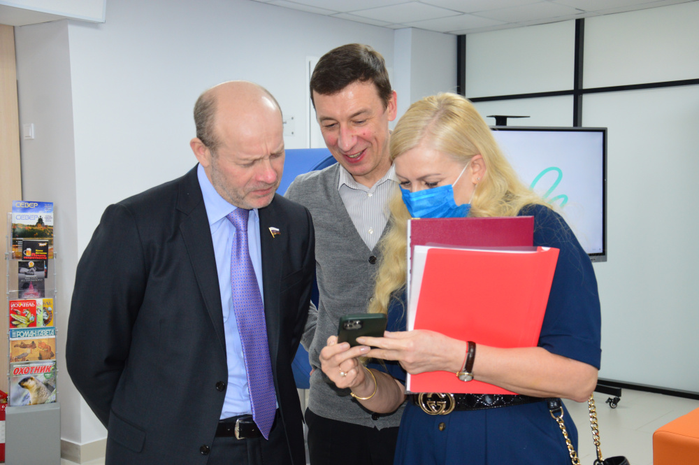 Вместе с главой муниципалитета Николаем Шимановичем и председателем Собрания депутатов Катав-Ивановского района Александром Васильевым он побывал в модернизированном учреждении культуры, отметил правильный подход к решению образовательной и увлекательной систем на территории. Коллектив библиотеки организовал для гостей экскурсию, путями которой проходят посетители храма книги. Все современные электронные ноу-хау востребованы молодежью, здесь любят работать и отдыхать школьники, делают множественные селфи, чтобы показать достопримечательность Катав-Ивановска. «На экскурсии здесь даже побывал коллектив местной полиции», - говорят библиотекари. Поток читателей за время открытия библиотеки после ремонта явно увеличился. И коллектив доволен, рассказывает об эмоциях посетителей. Родители с маленькими детьми также полюбили обновлённую библиотеку, где с большим удовольствием и пользой проводят свободное время. Почти все проникаются любовью к умному роботу Алексею, который запоминает имена читателей и хранит их в своей памяти. Главу района он поприветствовал так: «Здравствуйте, Николай! Давно вас не было в библиотеке. Рад, что вы пришли!» В свою память робот внёс и читателя Олега Колесникова и даже «погадал» ему, отметив, сколько собеседнику лет, что у него большая, дружная семья, которая любит читать. «Все правильно!» - подтвердили гости.