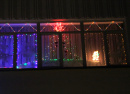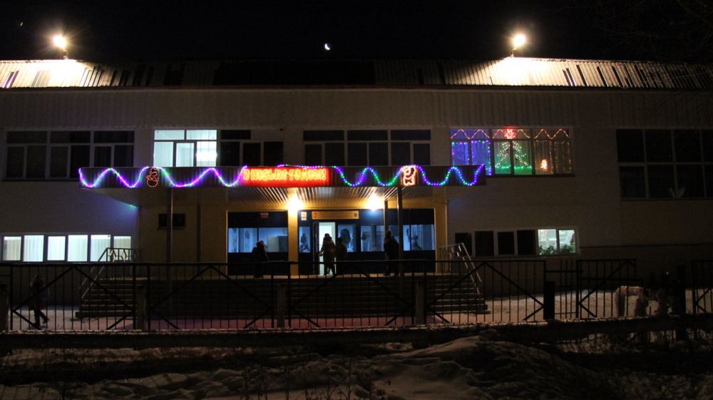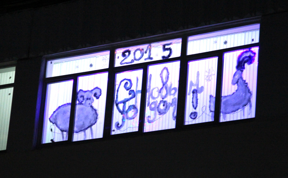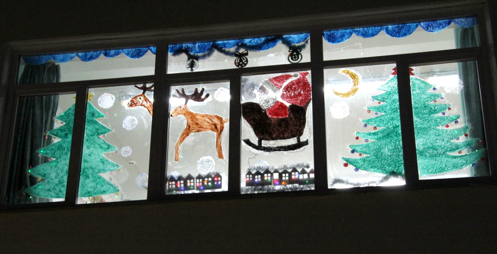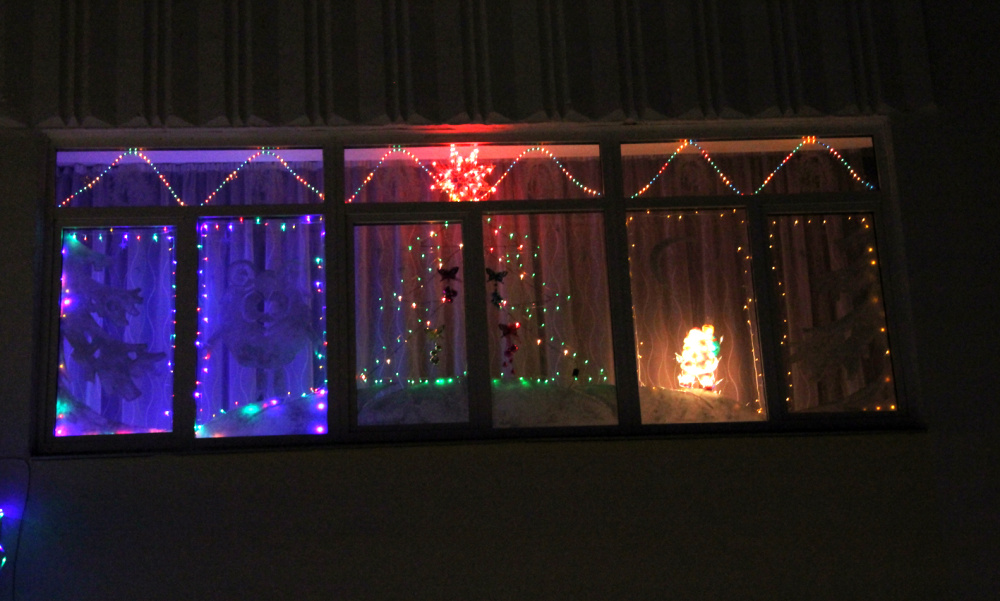 С начала декабря в классах закипела работа. По вечерам дети и родители вместе со своими классными руководителями становились настоящими дизайнерами. Они придумывали сюжеты, решали, какими материалами воплотить их в жизнь. Кто-то рисовал зубной пастой елку и Бараша из Смешарикова, кто-то представил целую сценку из сказа Бажова: на полянке расположились Серебряное копытце, у которого из-под копытца летят самоцветы, Даренка и Муренка. А вот целая новогодняя сказка, вырезанная из бумаги: елки, домики, Дед Мороз, спешащий к детям. Гирлянды, блестящие звезды, в разноцветных огоньках фигуры новогодних героев — все это превратило строгое здание школы в красочный сверкающий сказочный дом.