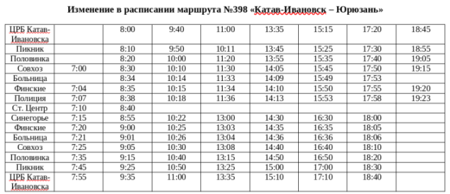 В связи с переводом на регулируемый тариф устанавливается единое расписание маршрута №398 «Катав-Ивановск – Юрюзань».