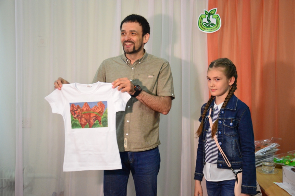 Специальные подарки от Арт-агентства приготовил его директор Артём Щукин. На футболки он нанёс рисунки юных авторов и логотип конкурса. Получилось очень оригинально и качественно. Его идея понравилась абсолютно всем, поскольку каждый из сувениров – эксклюзивный, одинаковых нет. Фирменные футболки от дизайнера Артёма Щукина теперь будут с удовольствием носить Екатерина Хлыбова (работа «Цветные сны»), Надежда Мурыгина (работа «Там лес и дол видений полны»), Софья Ефимова (работа «Утки-касатки»), Диана Трушина (работа «Дикие лошади»), Татьяна Типтюк (работа «Гора-кошка»), Виктория Климова (работа «Утро в лесу»), Алёна Сандалова (работа «Розовое поле»). Артём Владимирович рассказал о работе в жюри, отметил находки ребят и пожелал им отличных каникул, которые должны пройти с пользой.
