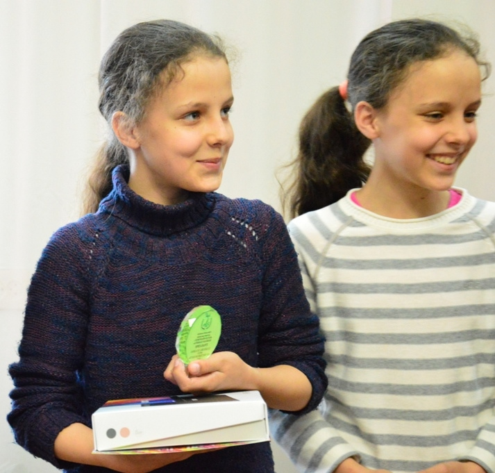 Пока дошла очередь до вручения Гран-при муниципального конкурса «Катав-Ивановск – зелёная планета», я обратила внимание на Полину Хлыбову, это же её ждали планшет последней модели одной из известных фирм и хрустальный глобус с логотипом. Сразу замечу, что сёстры Хлыбовы – тройняшки, так вот две сестры уже подарки получили, а Полина – пока ничего. И она предположила, что все награды уже вручены, опустила голову. «Полина – вы же абсолютный победитель! Идите за подарками!» - выдержав небольшую паузу, объявил Олег Алексеевич. Здесь надо было видеть лицо девочки: сначала удивление, потом – радость, причём такая неподдельная! «Я, правда, не ожидала, что получу такой дорогой планшет! Это чудо!» - только и смогла произнести Полина. Поддержать её пригласили родных сестричек и Татьяну Типтюк, которая сочинила четверостишие к рисунку подруги. Это обладательнице Гран-при пришла идея – закрыть на замок дым от заводов, именно этот сюжет она и отобразила в своей великолепной работе.