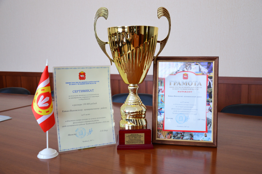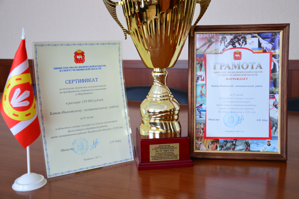 Министр физической культуры и спорта Челябинской области Леонид Одер передал главе района Евгению Киршину грамоту министерства, кубок и сертификат на 150 тысяч рублей для приобретения спортивного инвентаря и оборудования.