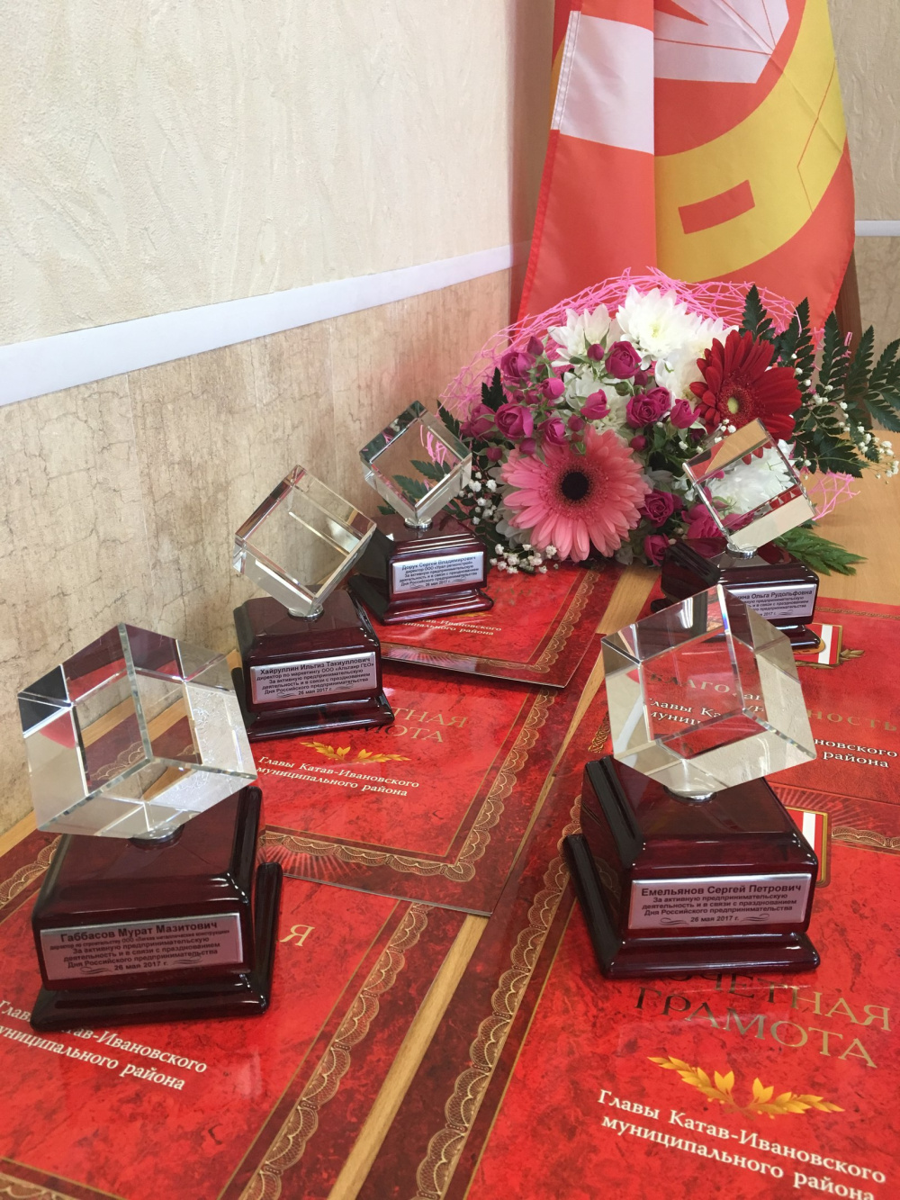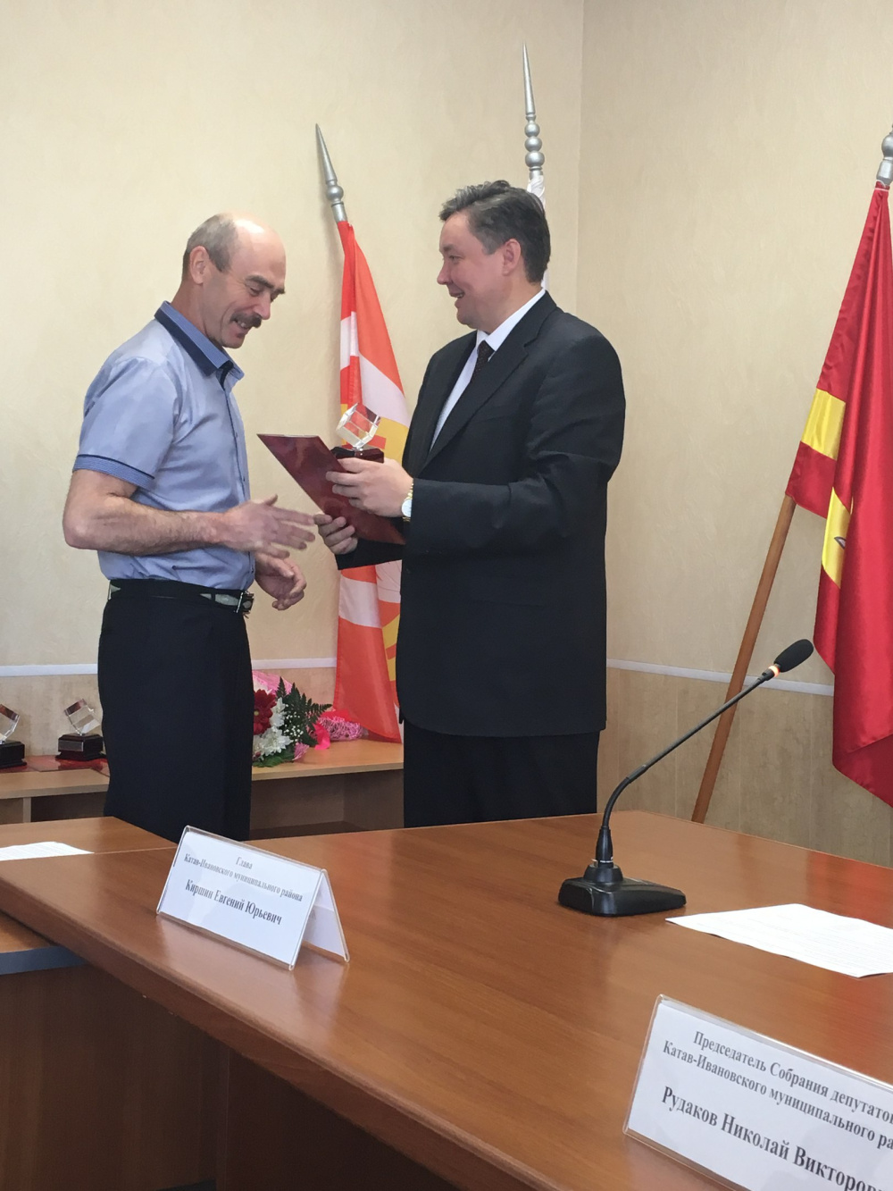 На координационном совещании с руководителями федеральных структур и главами городских поселений 29 мая глава района Евгений Киршин вручил им Почётные грамоты и Благодарственные письма, а также фирменные статуэтки - хрустальный куб на подставке из красного дерева.