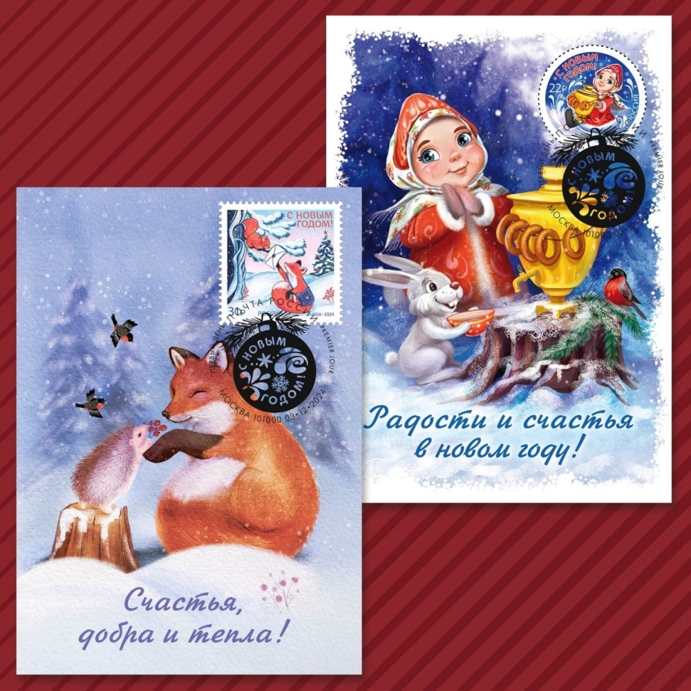Почта выпустила две новогодние марки со сказочными сюжетами авторства Татьяны Мячиной и Зинаиды Фармановой. Работы художниц выиграли конкурс эскизов почтовых марок.