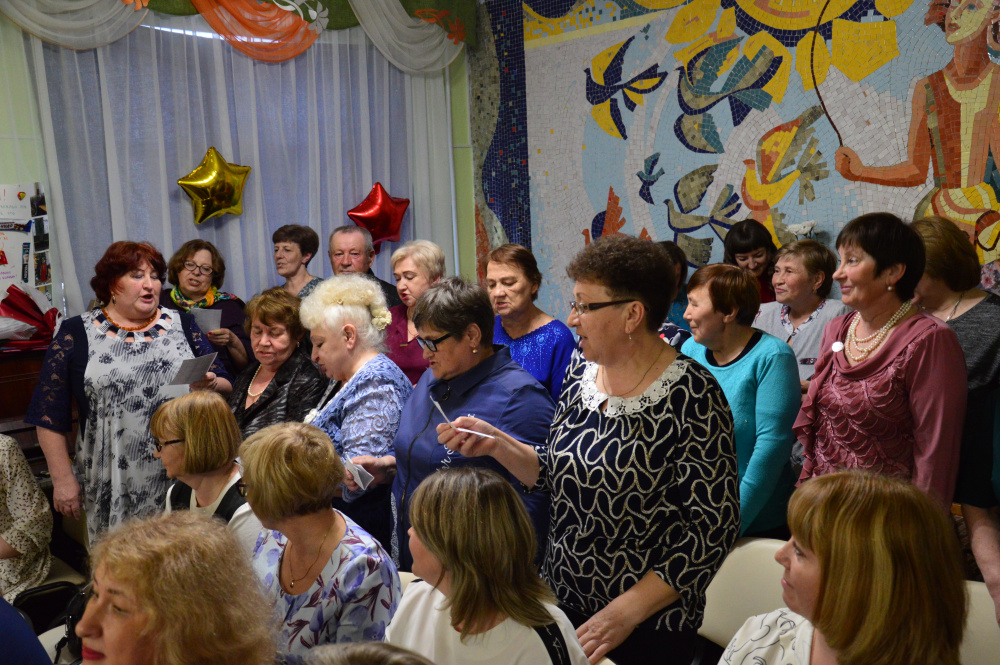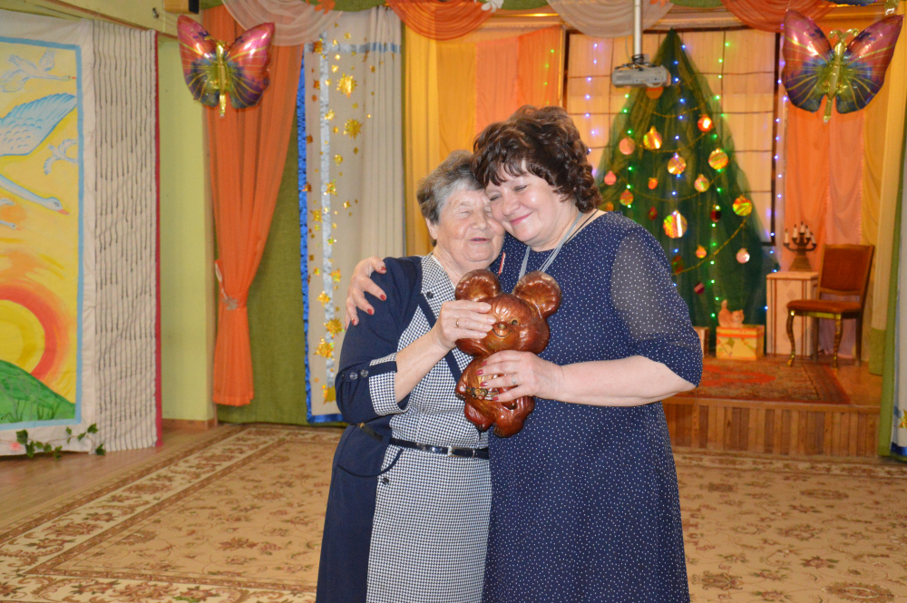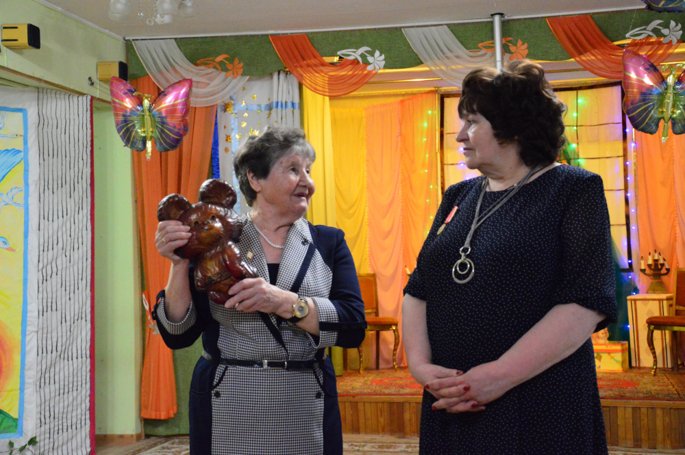 Нельзя не отметить активных заслуженных ветеранов детского сада. Первая заведующая «Медвежонка» Вера Ивановна Соловьева рассказала собравшимся как проходила народная стройка. Вера Ивановна вручила детскому саду фигурку Олимпийского мишки, как символ начала строительства детского сада «Медвежонок». А ветераны исполнили песню «С днём рождения».