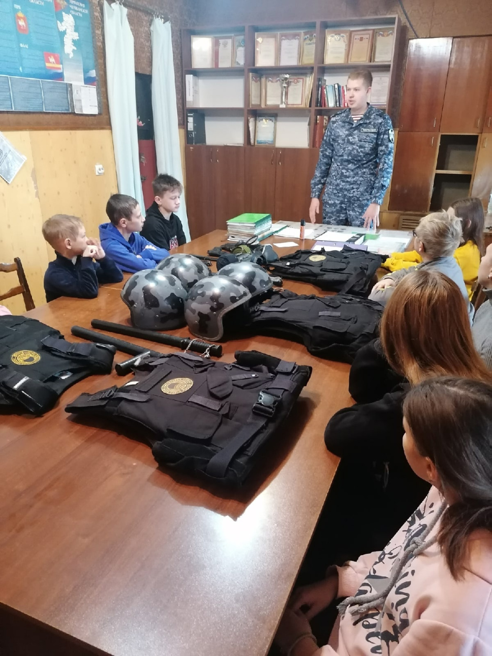 Очень интересную экскурсию провел для ребят командир отделения Немытов Д. А. Он рассказал какие задачи выполняет Росгвардия, чем отличается от полиции, какие полномочия имеют сотрудники, показал экипировку и спецсредства. Мальчишки с интересом рассматривали бронежелеты, примеряли шлема. Также Даниил Александрович рассказал, кого берут на службу в такую структуру, и какое требуется образование. А в конце экскурсии ребята получили возможность посидеть за рулём настоящей патрульной машины, включить проблесковые маячки и спецсигналы.