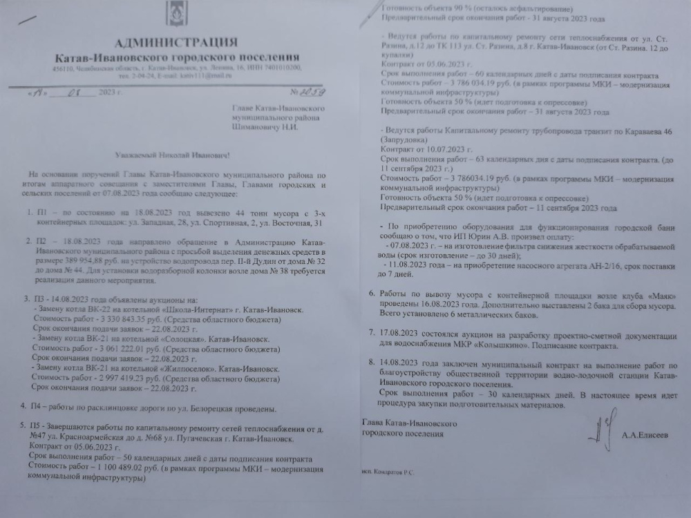 Сегодня, 21 августа, в районной администрации прошло аппаратное совещание с главами поселений. Начал совещание Николай Иванович с поручений, которые были даны на прошлом совещании (14 августа). Все вопросы были к главе Катав-Ивановска Андрею Елисееву. 18 августа в администрацию района поступило письмо с информацией по поручениям (фото в приложении). Однако по большинству пунктов остаются вопросы.