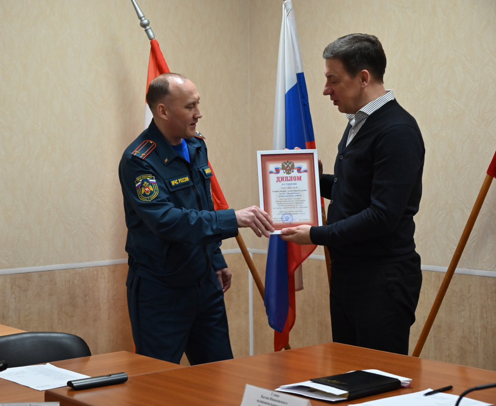 В начале совещания Зайцев Денис Иванович, начальник 14 ПСЧ 10 ПСО ФПС ГПС ГУ МЧС России по Челябинской области вручил Главе района диплом 2 степени по итогам конкурса «Лучшая единая дежурно-диспечерская служба муниципального образования Челябинской области в 2023 году».