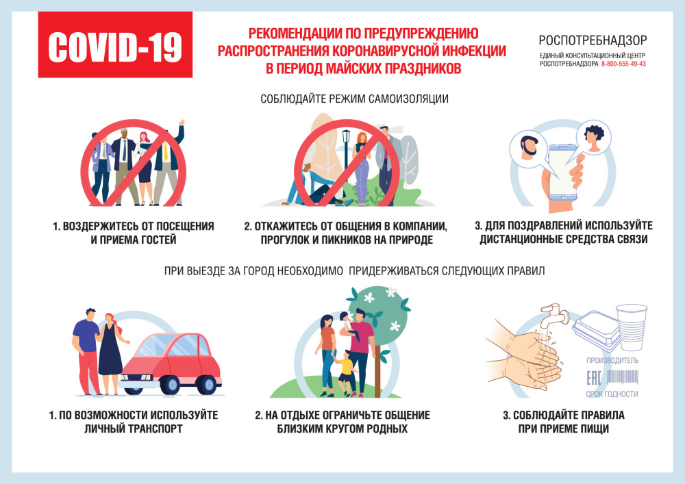 - не расширяйте круг общения, проведите майские праздники с теми, с кем контактировали (находились в одной квартире на самоизоляции) в будние дни; избегайте контактов/общения с соседями по дачному участку и компаниями на отдыхе на природе, соблюдайте социальное дистанцирование (1,5 м);