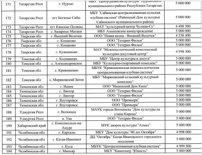 К сведению читателей скажу, что создание Федерального фонда социальной и экономической поддержки отечественной кинематографии инициировано профильным Комитетом РФ и поддержано Правительством страны, программа фонда успешно работает уже 12 лет. Цели и задачи его вполне понятны, и основной задачей государственной программы является оказание помощи в создании новых кинозалов в населённых пунктах, жители которых не имели возможности смотреть фильмы в кинотеатрах. Средства, выделяемые на безвозвратной основе в размере до пяти миллионов рублей, предоставляются на закупку нового оборудования. По основным статьям расходов за счёт средств субсидии могут быть приобретены: цифровое и звуковое оборудование, киноэкран, система для 3Д-показа, кресла, программно-аппаратные средства, а также должна быть включена и установка данного оборудования.