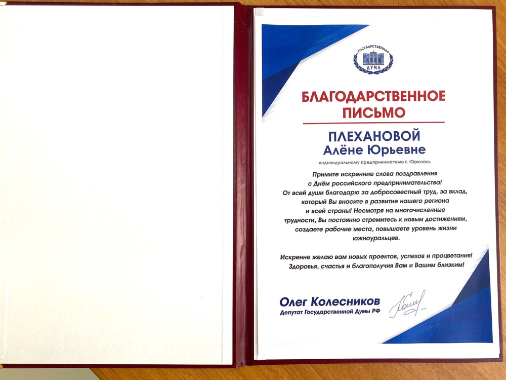 По поручению депутата Госдумы России Олега Колесникова сегодня я поздравила успешных предпринимателей, которые имеют устойчивый общественный рейтинг в Катав-Ивановске и Юрюзани. Благодарности, ценные подарки от Олега Алексеевича вручены индивидуальным предпринимателям: Петру Емельянову, Елене Буяльской, Алене Плехановой.