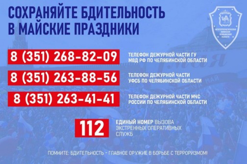 В преддверии майских праздников напоминаем Вам не ослаблять бдительность и публикуем необходимые телефоны.