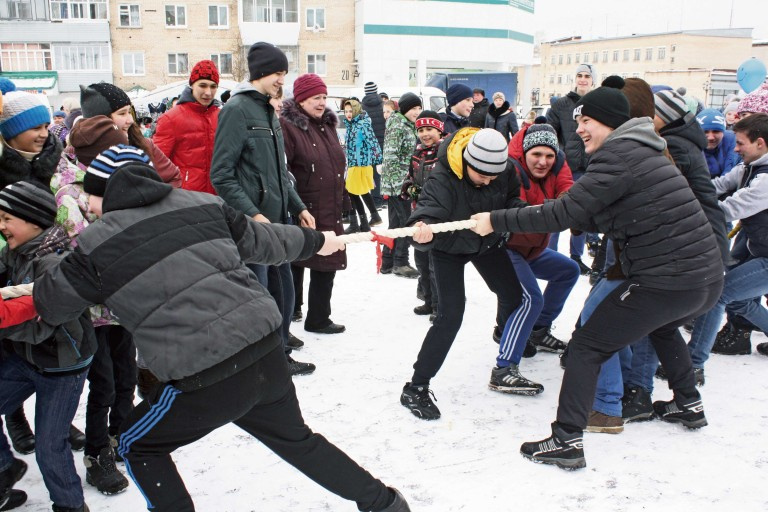 Ребятня веселилась на бревне, сшибая друг друга мешками, другие мерились силой в перетягивании каната. Скучно не было никому.