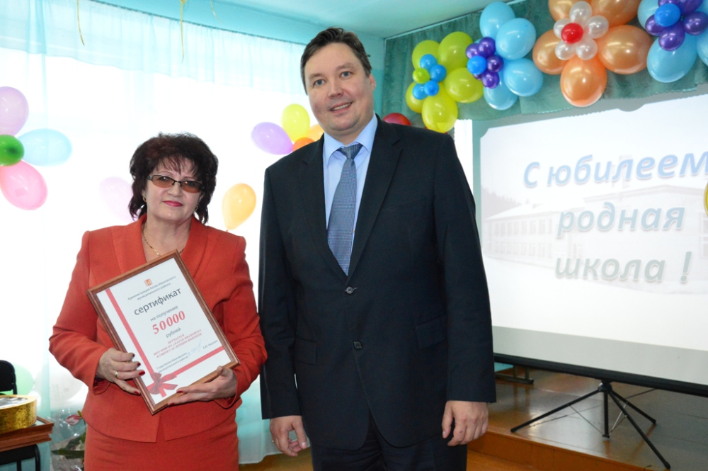 В день славного юбилея поздравить педагогов и детей пришел Евгений Киршин. В поздравительном слове он пожелал всему коллективу успехов в деле воспитания нового поколения, в руках которых будущее нашего района. В честь праздника глава района вручил школе сертификат на 50 тысяч рублей.