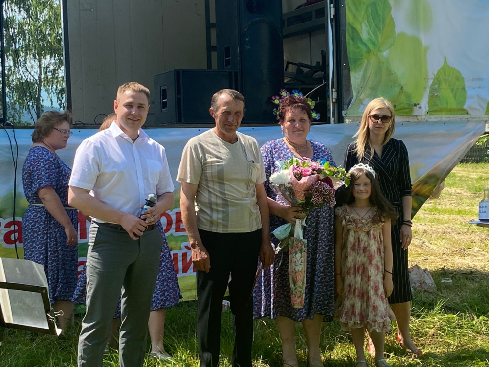 Представители от района тоже приехали поздравить жителей. Руководитель Депутатского центра партии «Единая Россия» Вера Шарафутдинова и депутат Собрания депутатов муниципалитета, член фракции «Единая Россия» Данила Гулин вручили поздравительные адреса от имени главы района и отдела ЗАГС памятные подарки юбилярам супружеской жизни семье Мурыгиных – Алексею Николаевичу и Анастасии Ивановне, отметившим 10-летие совместной жизни (Розовая свадьба). Также поздравления принимали Хайдуковы Александр Васильевич и Ольга Леонидовна, которые вместе прожили 20 лет (Фарфоровая свадьба), и Иван Григорьевич и Наталья Владимировна Смоляниновы, семейный стаж которых 35 лет (Коралловая свадьба). Самый серьезный юбилей в этом году отметили семья Николая Андреевича и Веры Викторовны Черновых – 45 лет супруги вместе (Сапфировая свадьба).