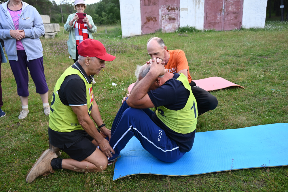 По нормам ГТО участники сдавали четыре вида упражнений для своего возраста: скандинавская ходьба, подъем туловища из положения лежа, сгибание-разгибание рук, наклоны на гибкость.