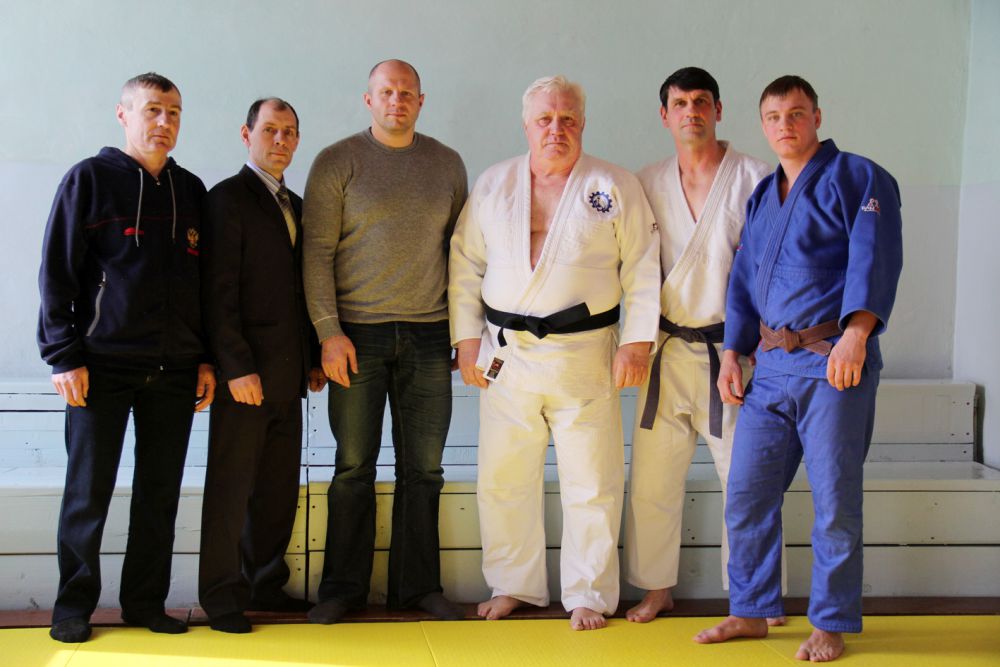 Виктор Обухов (третий справа) и другие тренеры ДЮСШ Катав-Ивановска встречают у себя в гостях Федора Емельяненко (третий слева).