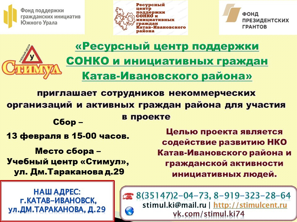 Учебный центр «Стимул» при финансовой поддержке Фонда развития гражданских инициатив Южного Урала с 1 февраля 2024г. продолжает работу Ресурсного центра поддержки социально ориентированных некоммерческих организаций и инициативных граждан Катав-Ивановского района.