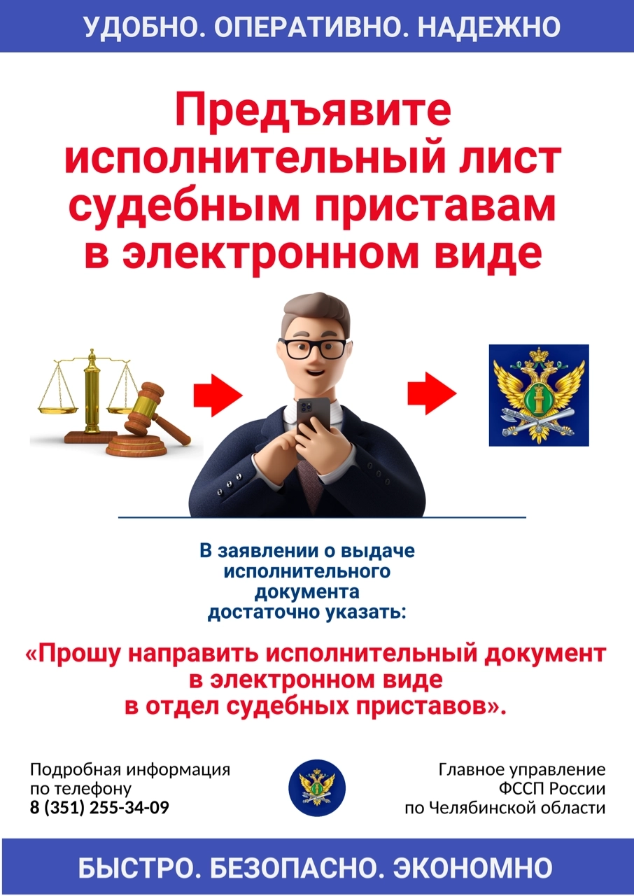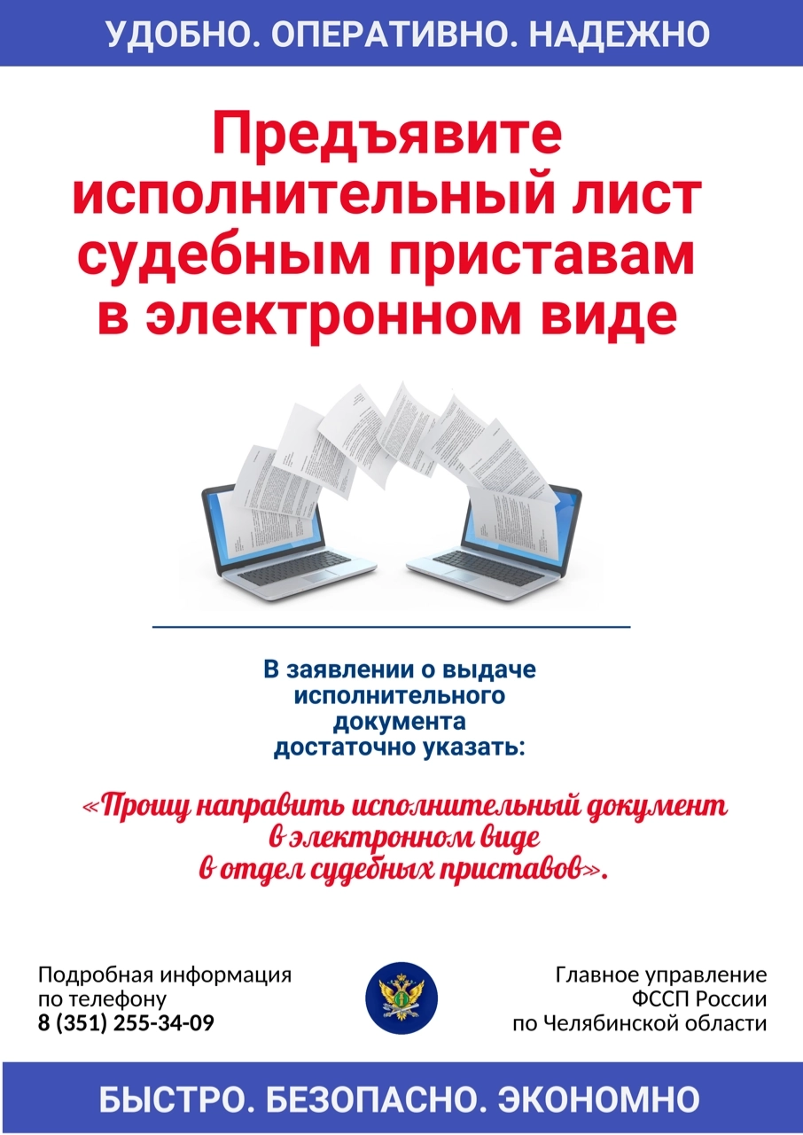 ГУФССП России по Челябинской области напоминает, что в соответствии со статьей 428 Гражданского процессуального кодекса Российской Федерации исполнительный лист может направляться судом для исполнения в форме электронного документа, подписанного судьей усиленной квалифицированной электронной подписью. Это исключает необходимость граждан-взыскателей лично приезжать к судебному приставу или посылать документы почтой.