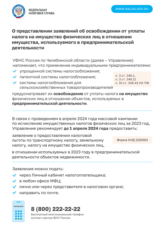 УФНС России по Челябинской области напоминает о подаче заявления по налогу на имущество ИП