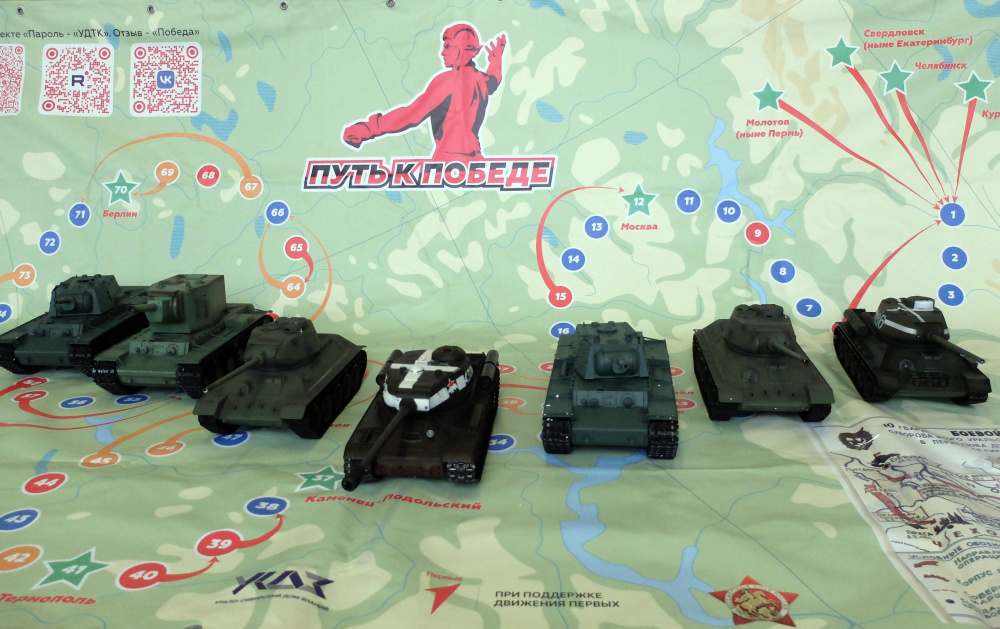 Локация 4. В фотозоне площадки каждый сможет представить себя членом танкового экипажа, облачившись в военную танковую форму, или героем тыла, вытачивающим детали для танка на легендарном Челябинском Кировском заводе. Локация 5. Виар-зона детской площадки с помощью виар-шлемов перенесет вас сначала в цех Магнитогорского металлургического комбината, где вы откроете секрет броневой стали, затем – на сборку легендарного танка прорыва – КВ-1 и в завершение квеста – к развалинам рейхстага, чтобы оставить памятную надпись в честь героя - южноуральца.