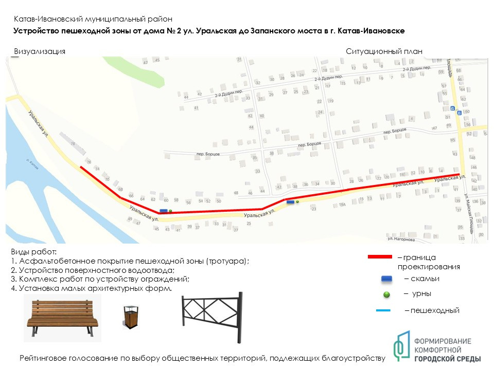 Благоустройство пешеходной зоны от дома № 2 ул. Уральская до Запанского моста г. Катав-Ивановск.