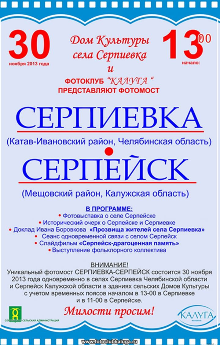 Фотомост состоится 30 ноября в 13.00 при поддержке фотоклуба «Калуга». Внимание — с учетом временных поясов, в Серпейске мероприятие начнется в 11.00.