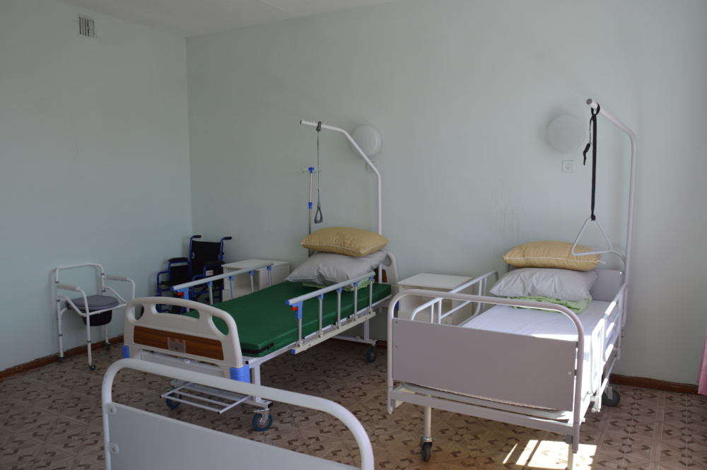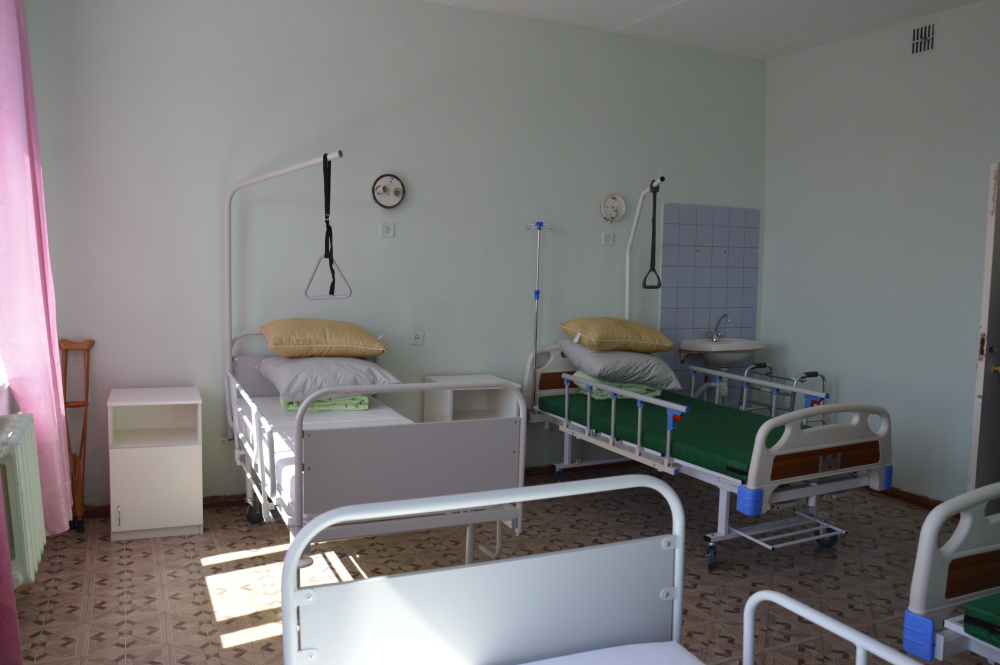 Для удобства размещения и проведения реабилитации в отделение приобретено специальное оборудование – вертикализатор, новые современные кровати для тяжелобольных с противопролежневыми матрасами, кресла-коляски и необходимый инвентарь. Для удобства передвижения маломобильных пациентов в санитарных комнатах установили специальное сантехническое оборудование. При помощи местных предпринимателей сделан косметический ремонт, установлены новые окна. Ремонт сделали с душой, отделение получилось хорошее - уютное и чистое.