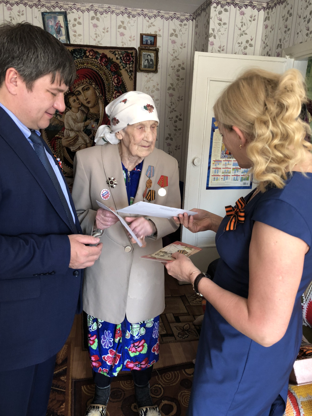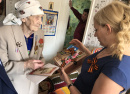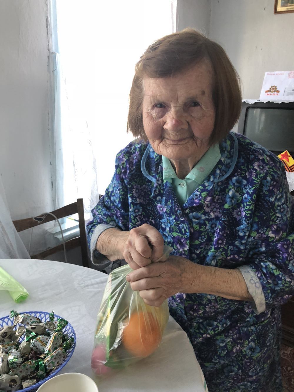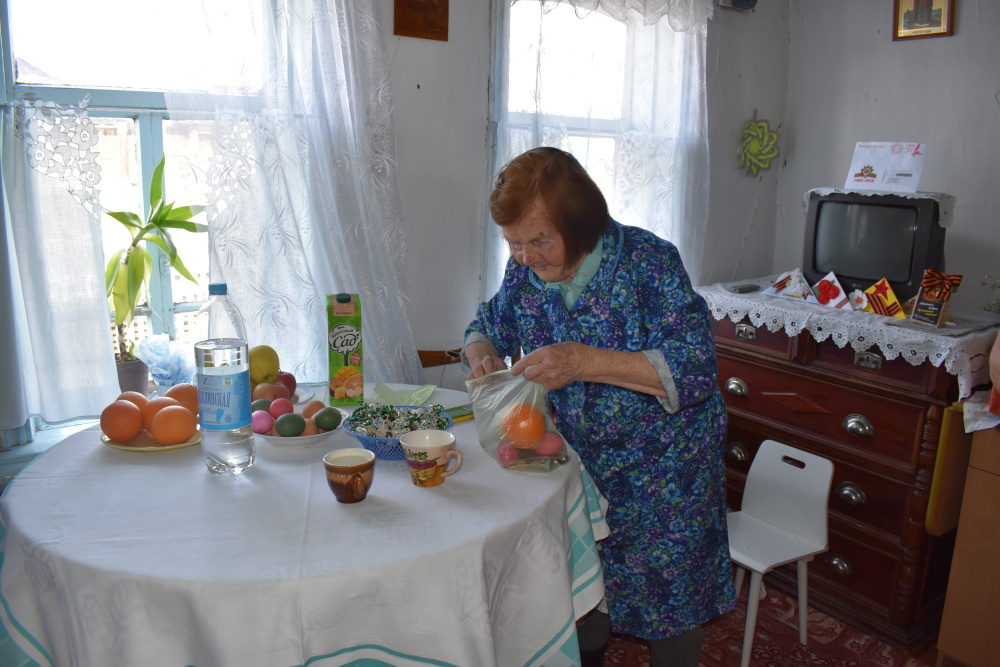 Вдова участника Великой Отечественной Фёдора Ивановича Лебедева встретила нас как своих родных людей. С утра выбирала платье для фотографии, а потом велела принести её накидку с медалями. Полный комплект!12 июня ей исполнится 90 лет. Она с теплотой принимала подарки, благодарила. А на прощание по традиции спела нам песню. Память у неё отличная!