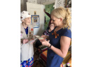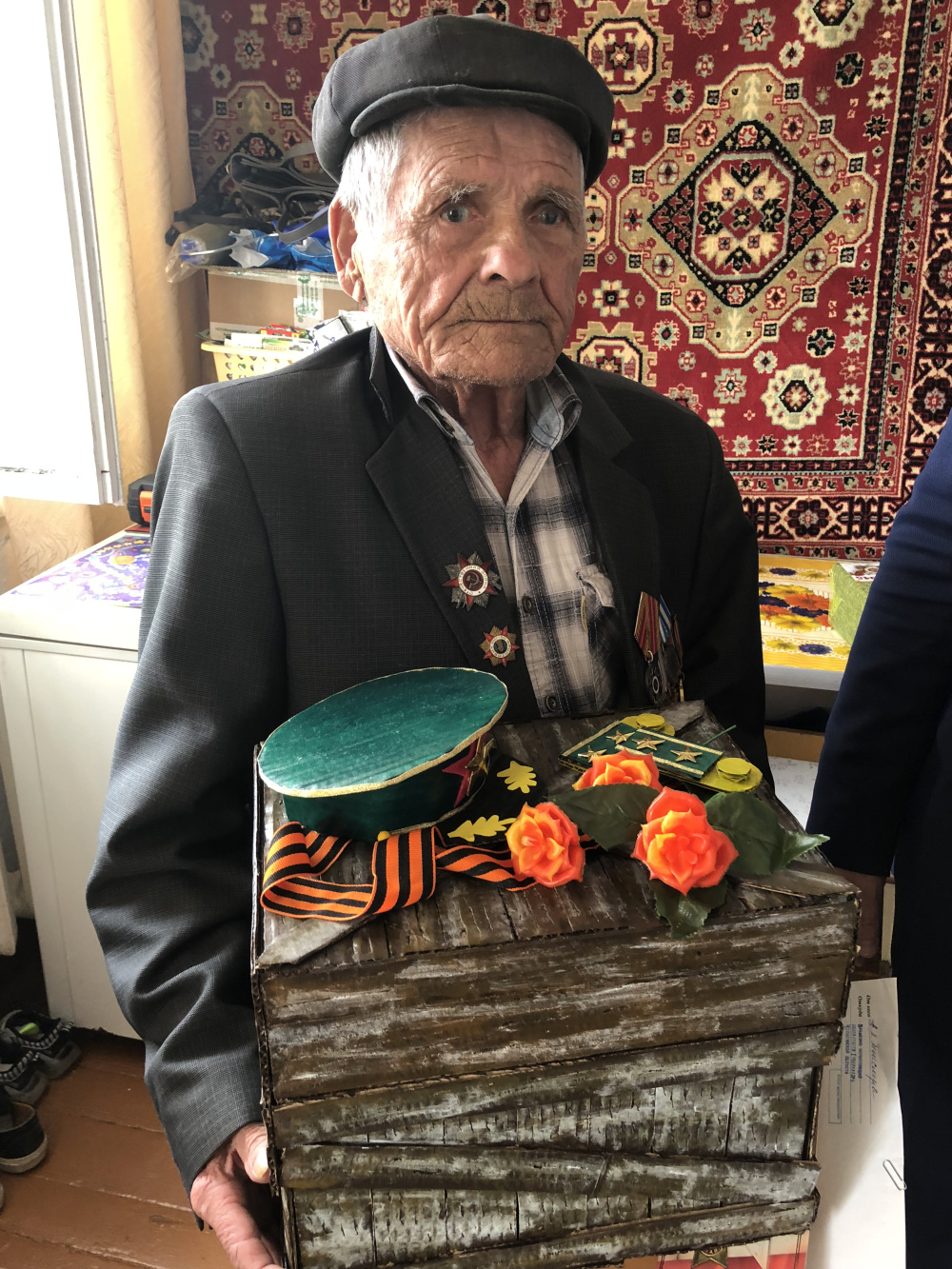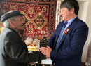 Далее наш путь лежал на улицу Салова, где в уютном доме у дочери Альфии Наиловны находился в это время участник Великой Отечественной войны Наил Касимович Хафизов. Счастливый отец, дед, прадед. Жизнь в доме кипит, каждый занят своим делом, у всех – отличное настроение, приятные хлопоты по хозяйству, где, как в Ноевом ковчеге, есть много домашней живности. Даже кот своё место знает, лежит себе в коробке. Наил Касимович после Великой Отечественной служил пять лет в Армии в Китае, даже поговорку придумал, что в Катаве жить лучше чем в Китае. До сих пор помнит военные команды на китайском языке. И вообще он бесконечно позитивный человек! Ему 93 года. У Хафизова трое детей, пятеро внуков, девять правнуков, он назвал имена всех девятерых! Теперь же у него гостит внучка и двое правнуков – Итон и Эйден. «В 1975 году, когда я работал на литейном, участников Великой Отечественной только на одном заводе насчитывалось 285, а теперь в районе нас всего 13, - делится информацией Наил Касимович. – Сорок лет я отдал заводу, и работа была далеко не из лёгких»! «В прошлом году у нас папа сено сам косил, - в диалог вступает Альфия Наиловна, - он у нас большой молодец и самый лучший. Все его любят! И все мы в нём нуждаемся!» Любит Наил Касимович читать, надевает двое очков – и вперёд. А правнуки обожают с ним играть. Словом, в семье он незаменимый человек. Наил Касимович всех благодарит за внимание и подарки, ему было приятно!