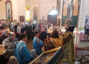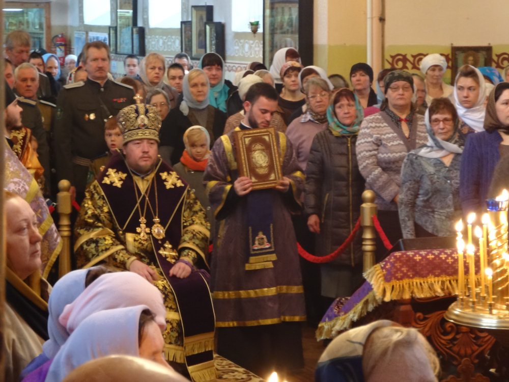 На крыльце храма владыку приветствовали взрослые казаки с казачатами, а прихожане, образовав живой коридор, поздравляли всех прибывших с праздником. Божественная литургия длилась полтора часа. Под сводами собора величаво и чисто звучали песнопения, а также проповедь в честь Преподобного Иоанна Лествичника, который почитается как великий подвижник и автор духовного творения «Лествица». В 16 лет он пришел в Синайский монастырь, где долгое время подвизался в послушании духовному отцу, по кончине которого избрал отшельническую жизнь, удалившись в пустынное место на 40 лет. В 75 лет был избран игуменом Синайской обители, где написал руководство для восхождения к духовному совершенству. Примеры из «Лествицы» служат образцом святой ревности о спасении, которая необходима каждому желающему жить благочестиво. К чему и призвал собравшихся владыка Викентий.