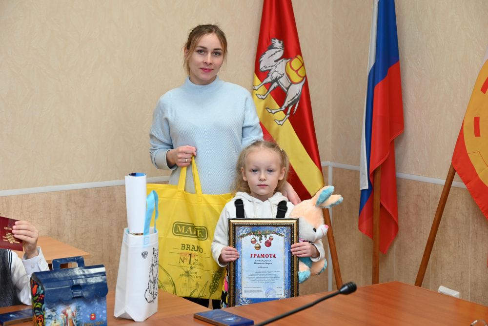 Также Татьяна Павловна вручила диплом и подарки Марии Плехановой. Эта маленькая девочка сделала своими руками елочную игрушку и заняла 2 место в областном конкурсе.