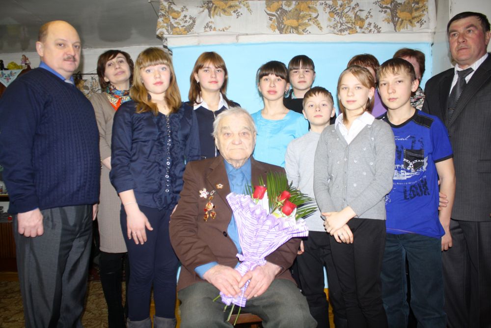 На этом торжественный момент не закончился, потому что в гости к ветерану пришли с тортиками еще и ученики местной школы. Они тоже поздравили человека, на которого ровняются, которого уважают, у которого перенимают знания и опыт. Им повезло — они еще застали таких великих людей…