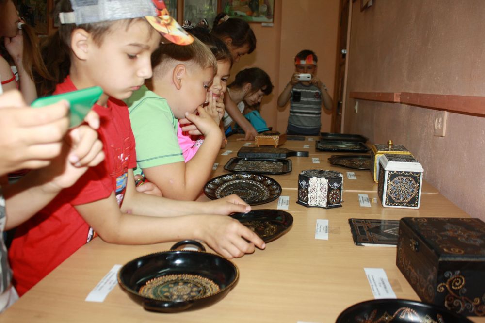 Шумная детвора рассматривала шкатулки, разносы, декоративные доски, на которых с помощью специальных акриловых контуров были нанесены затейливые узоры, картины, писаные акварелью и нарисованные простым карандашом, и задавали вопросы начинающим художникам. Одного мальчика интересовало, как ребята все это рисуют. Настя Красилова, одна из выпускниц-отличниц, рассказала детям о своих работах, откуда брала идею для своей композиции, какие существуют этапы в создании картины. Малышей интересовало, сколько времени тратят художники на создание своих работ, о чем их картины и почему половина из них одинаковые.