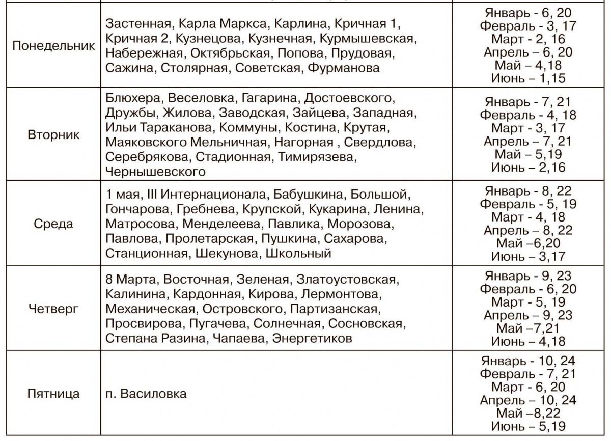 График вывоза ТБО из частного сектора г.Катав-Ивановска