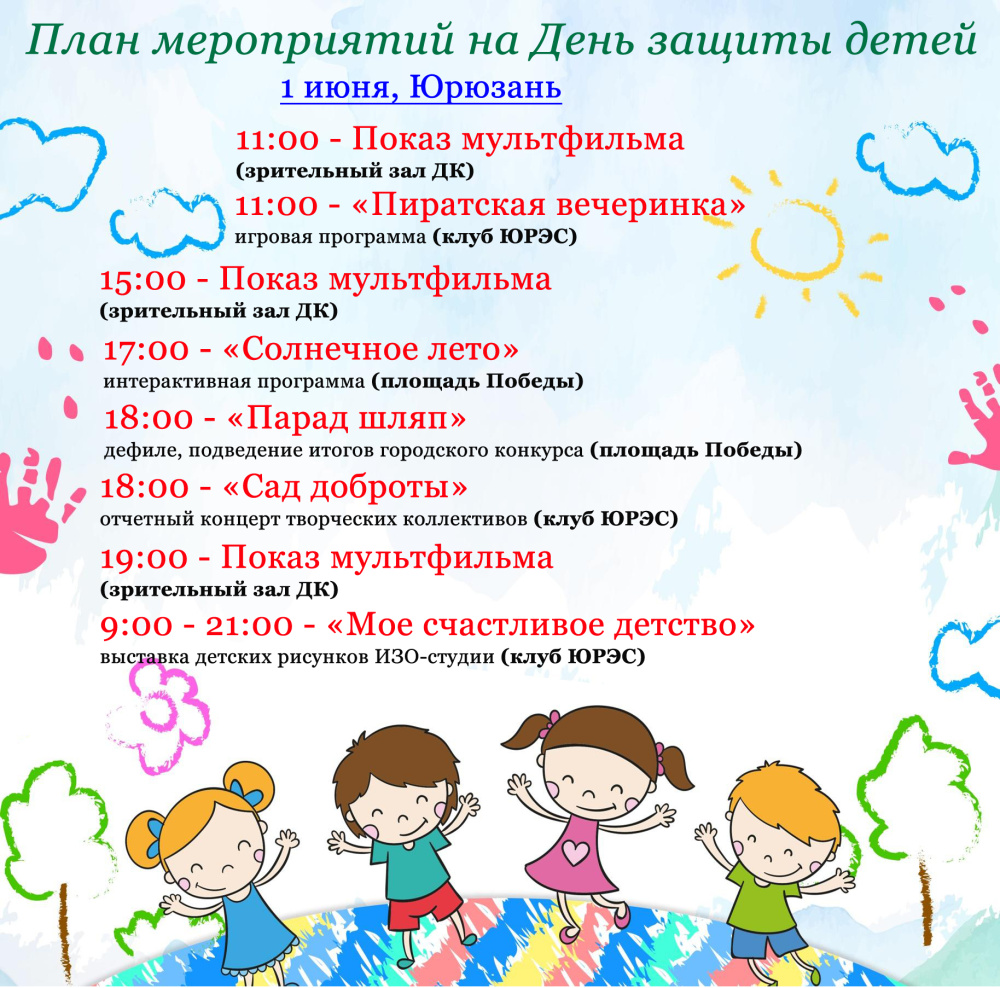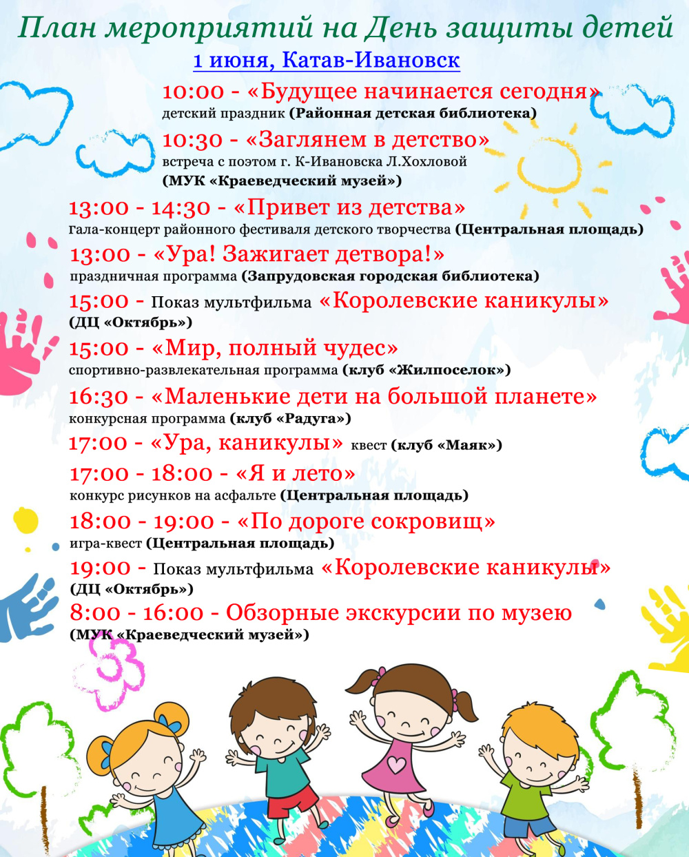 В Катав-Ивановске 1 июня праздничные мероприятия начнутся с 12 часов дня, с гала-концерта победителей и призеров районного фестиваля «Привет из детства» в центре досуга «Октябрь» и на главной сцене центральной площади. Далее все желающие ребята смогут посмотреть на большом экране кинотеатра мультфильм «Королевские каникулы», принять участие в конкурсе рисунков на асфальте и сыграть в квест «По дороге сокровищ».