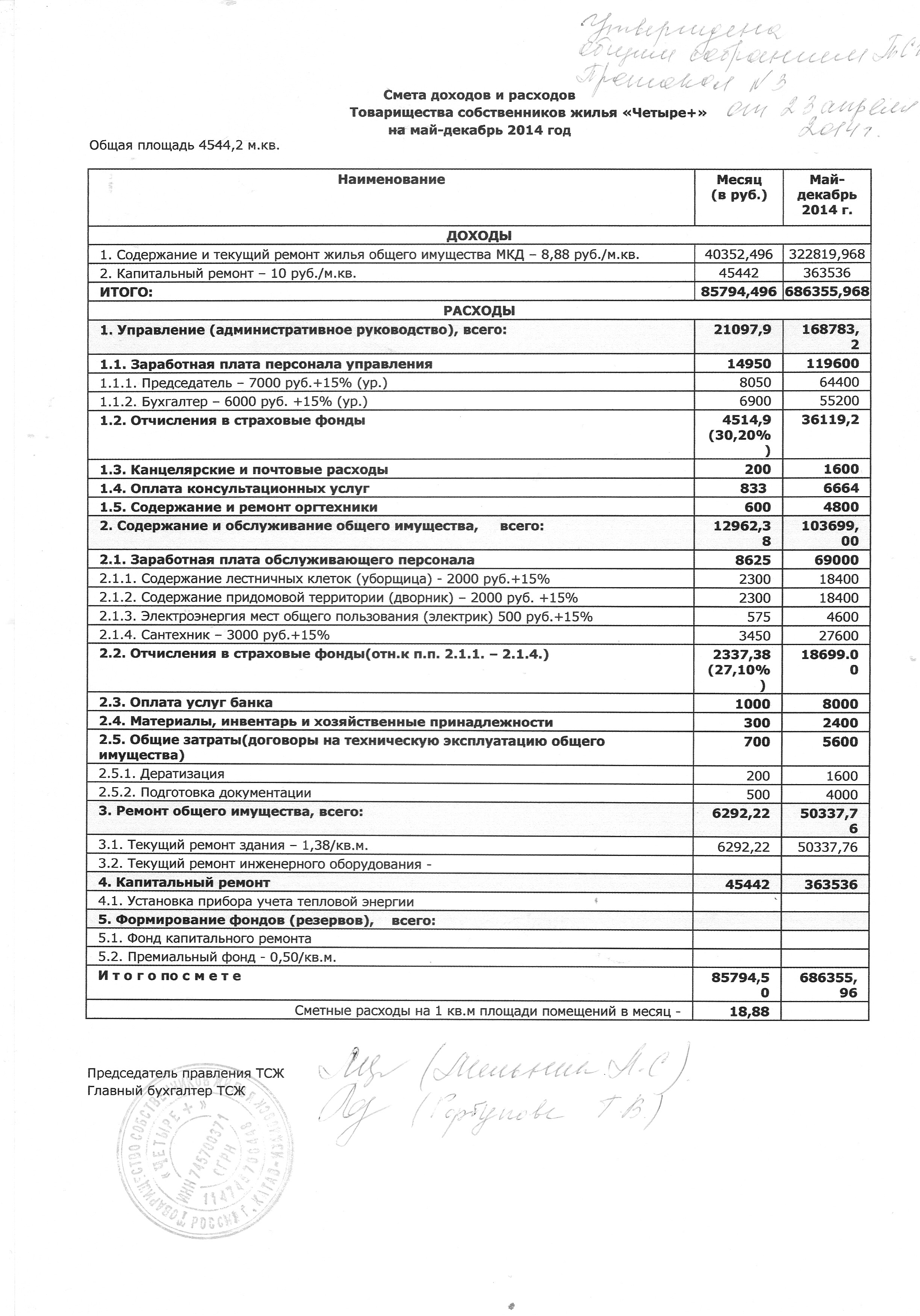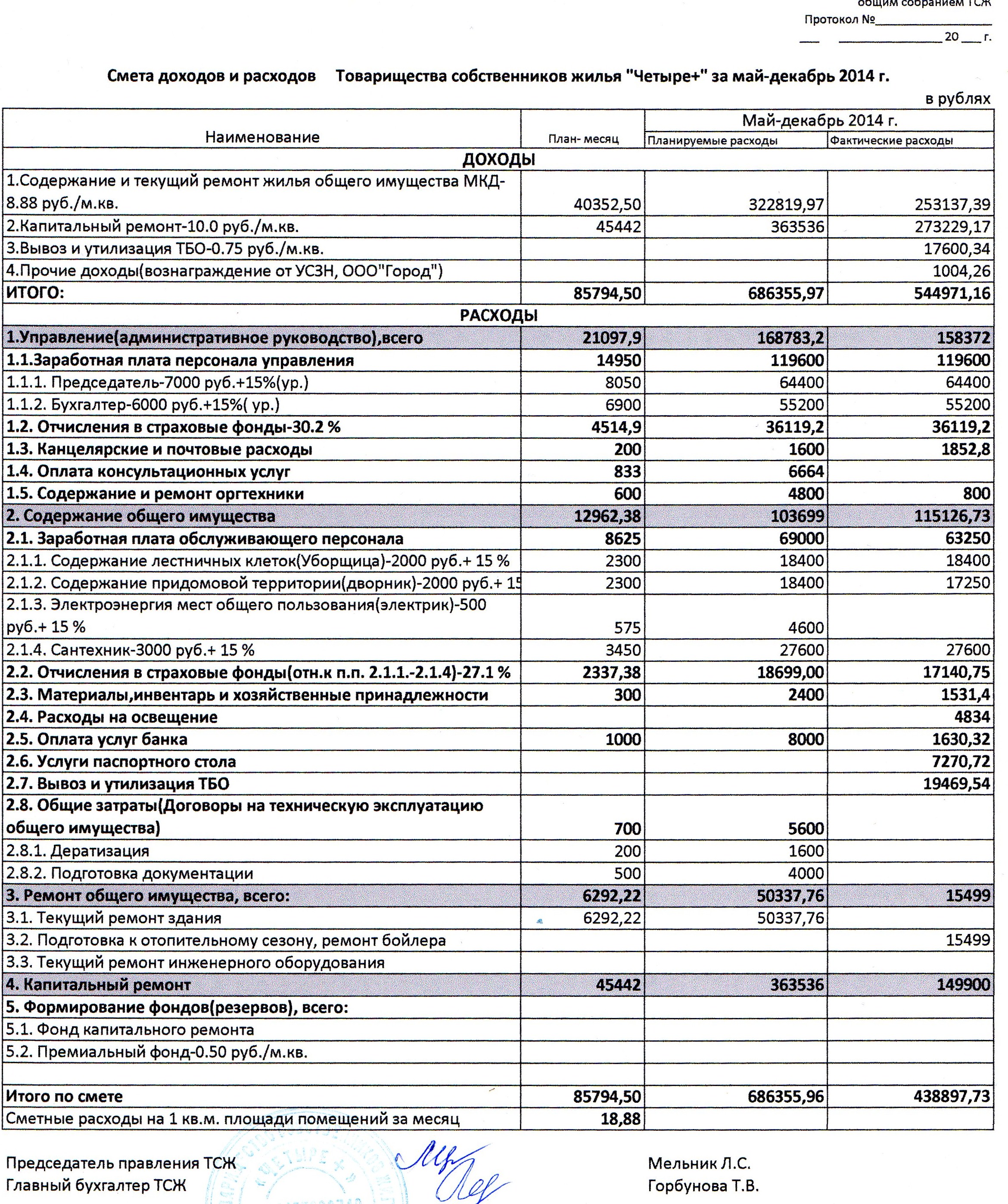 | Смета расходов Товарищества собственников жилья ТСЖ Четыре+ на май-декабрь 2014 (1.33 МБ) | 1.33 МБ |