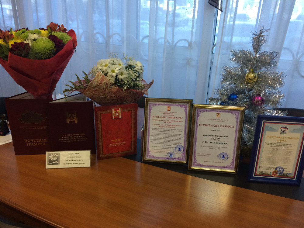 От Главы Катав-Ивановского муниципального района Е.Ю. Киршина, Председателя Собрания депутатов Катав-Ивановского муниципального района Н.В.Рудакова, Главы Катав-Ивановского городского поселения И.И.Норко, Председателя Совета депутатов Катав-Ивановского городского поселения Г.Ф.Федосеевой, руководителя исполнительного комитета Катав-Ивановского МО партии «Единая Россия» Е.В.Буровой не только сотрудники отдела ЗАГС района, но и ветераны службы, Ивойлова Г.Б., Логинова В.И, Васильченко Г.А., Стрельникова Л.Ю. получили слова благодарности за многолетний, добросовестный труд, за вклад в сфере государственной регистрации актов гражданского состояния.